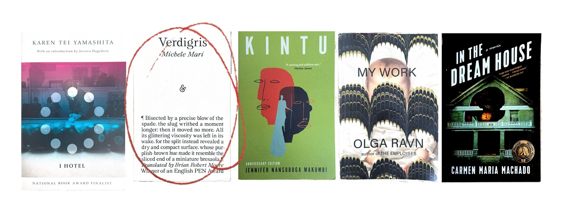 I Hotel by Karen Tei Yamashita, Verdigris by Michele Mari, Kintu by Jennifer Nansubuga Makumbi, My Work by Olga Ravn, In The Dream House by Carmen Maria Machado